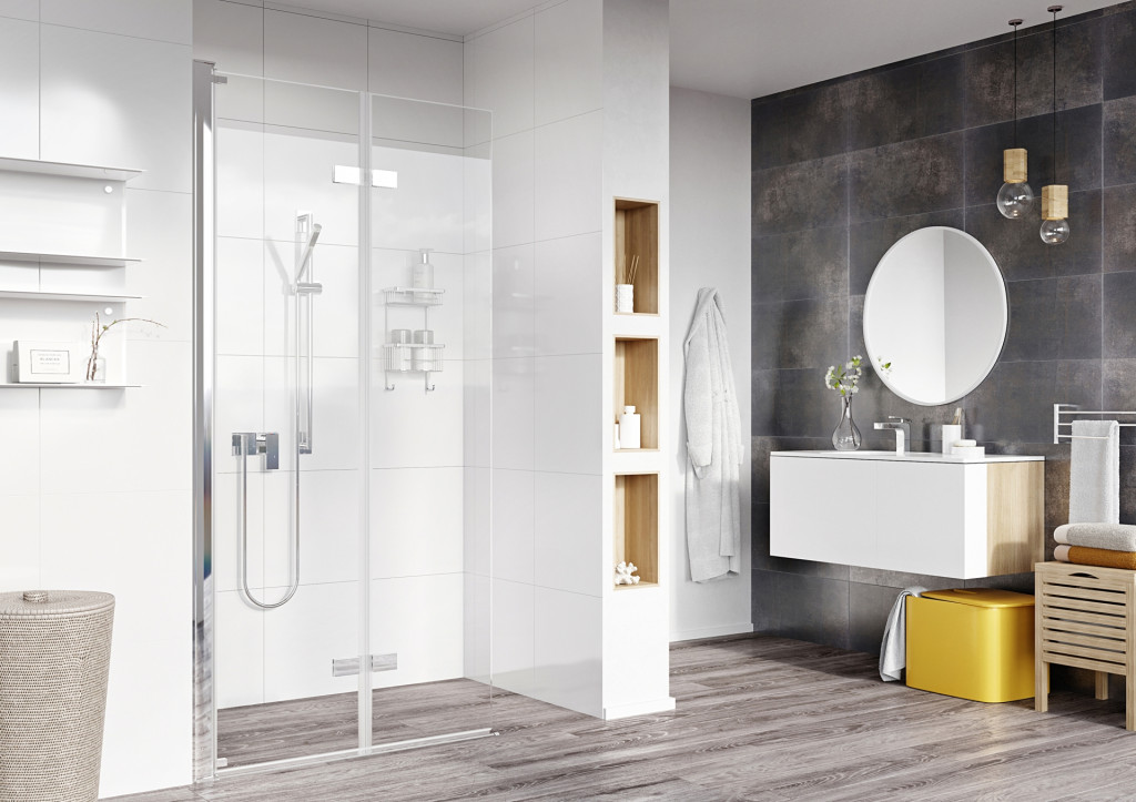 - Frameless inward folding panels with 180 pivoting action