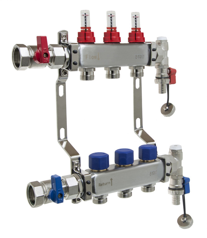 3 port stainless steel manifold comes with flow meter, isolation valves, drain off and manual air vents 326W x 320H x 90mmD