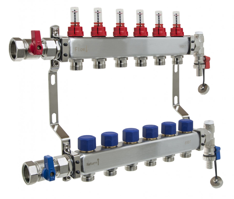 6 port stainless steel manifold comes with flow meter, isolation valves, drain off and manual air vents 476W x 320H x 90mmD