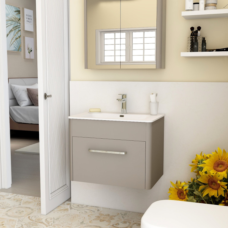 Suburb 600x395mm Single Drawer Wall Mounted Basin Unit in Matt Ash