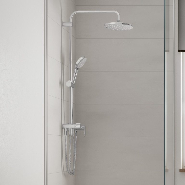 The hansgrohe Vernis Blend 200 Reno shower system (1 jet type) is the intelligent solution for simple bathroom refurbishments. It is connected to an existing tap or water connection on the wall (e.g. hansgrohe FixFit) via a second shower hose. Yet another advantage: The overhead or hand shower can be conveniently selected with just a twist. The water quantity and temperature are controlled separately using the existing tap. In so doing, if a bath tub is converted to a shower, for example, the bath mixer can continue to be used with a connection for a hand shower. Or the bath tub can be upgraded with a high-quality hansgrohe shower solution.