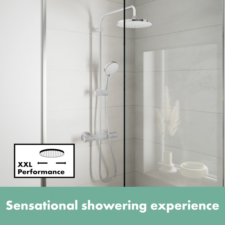 - Indulgent showering: The 205 mm overhead shower pampers with an even, luxurious water flow (XXL Performance)