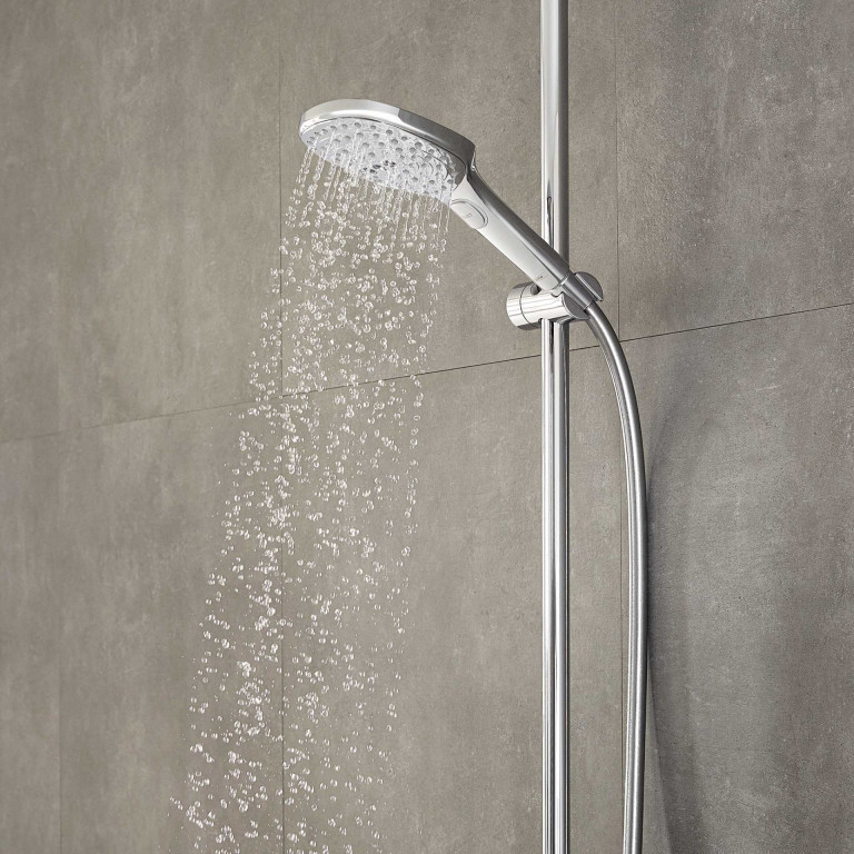 The iF design award winning Raindance Select E 120 hand shower from hansgrohe allows you to personalize your shower experience at the touch of a button. Use the handy Select button to seamlessly switch between three spray modes; Rain, RainAir and Whirl. The shower surface is fully chrome-plated with QuickClean technology for easy limescale removal.