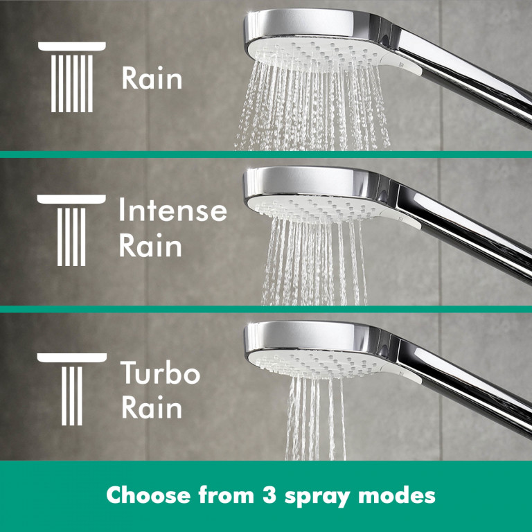 - Three spray modes for versatile showering pleasure: Rain, IntenseRain and TurboRain