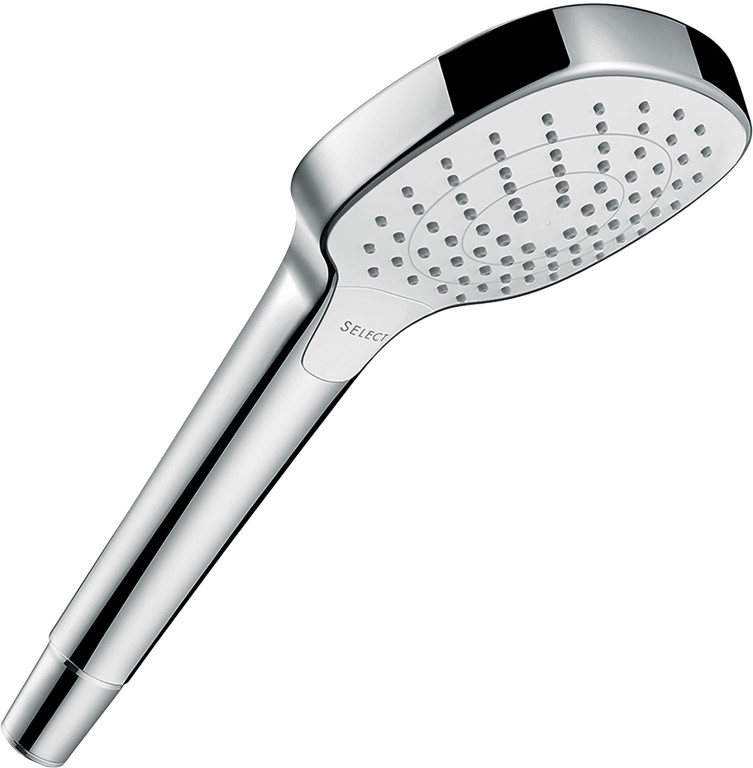 The Croma Select E Hand shower Vario from hansgrohe allows you to personalize your shower experience at the touch of a button. Use the handy Select button to seamlessly switch between three spray modes; Rain, IntenseRain and TurboRain. The high-quality chrome-plated finish is completed with a white spray disc that offers QuickClean technology for easy limescale removal.- The 110 mm wide shower head envelops the body with indulgent sprays (XXL Performance)