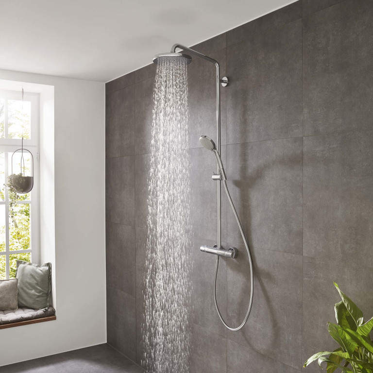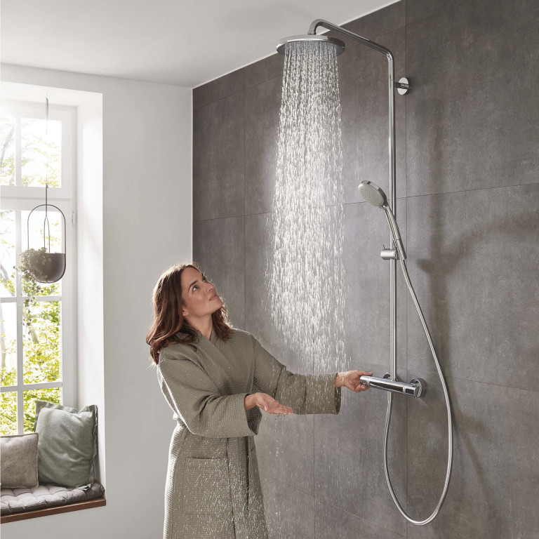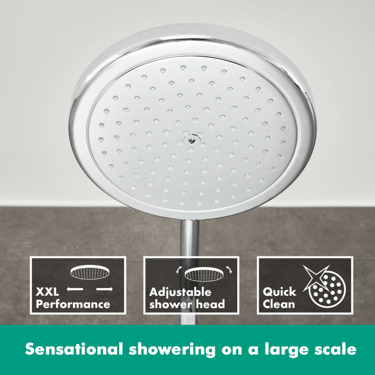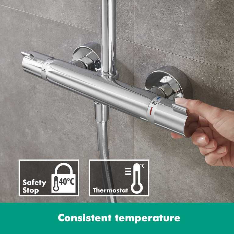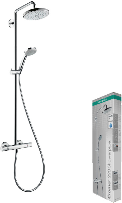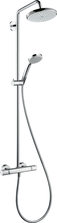 The Croma shower system 220 1jet with thermostat combines contemporary design with a large overhead shower that is 220mm in diameter and features hansgrohe RainAir spray. The hand shower enables you to fine tune your shower experience with four hansgrohe spray modes; Rain, Shampoo, Massage and Normal. Ecostat Comfort Thermostatic mixer keeps the water temperature constant and features SafteyStop to prevent unexpected increases in temperature. Shower surface has QuickClean technology for easy limescale removal.- Greater showering indulgence: large 110 mm overhead shower for a smooth, luxurious stream of water (XXL Performance)