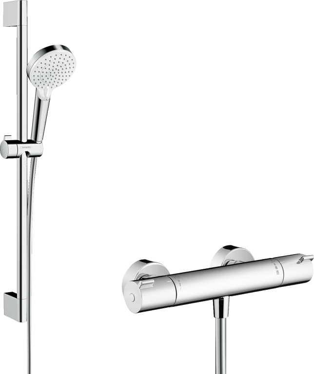 The set that has everything: The Crometta Vario shower set 0.65 m combines functional variety and puristic design. The shower thermostat for surface installation reliably provides the refreshing wet at the desired temperature, which is easy to set. The hand shower with a 100 mm shower head (XXL Performance) delights with two spray patterns: the strong rain shower (Rain) is ideal for thoroughly rinsing the hair, while body and spirit submit entirely to showering indulgence. The spray pattern IntenseRain is a strong cascade that activates the senses and pampers with its revitalising effect.