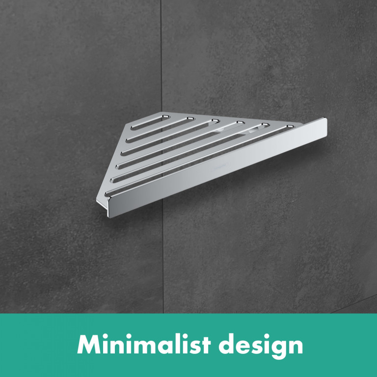 And the hansgrohe quality keeps the promises made by the premium design: THet AddStoris corner shelf for showers is made of stainless metal, so it is made to last. This product is both a sustainable use of resources and it reduces the amount of plastic in the environment. The surface finish is lavishly chrome-plated – a material that is easy to clean and keeps its shine.