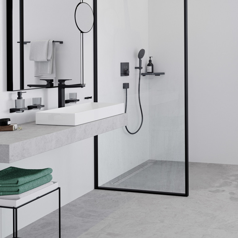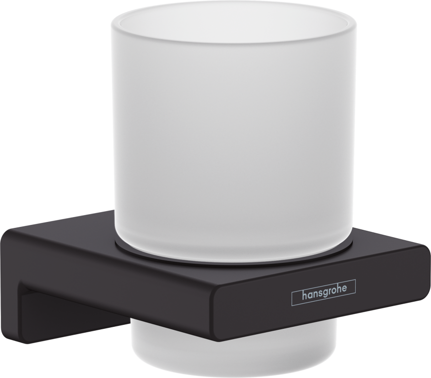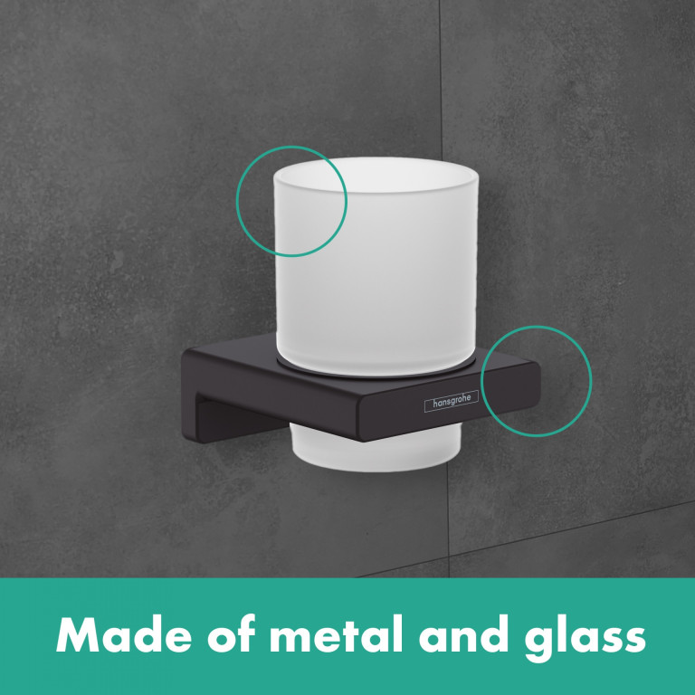 And the hansgrohe quality keeps the promises made by the premium design: THet AddStoris toothbrush tumbler is made of glass (94x68 mm). This product is both a sustainable use of resources and it reduces the amount of plastic in bathrooms. The wall support’s metal surface finish in a matt black colour is easy to clean and is one of the colour schemes in the range of hansgrohe special surface finishes for taps (FinishPlus). So everything can match perfectly.