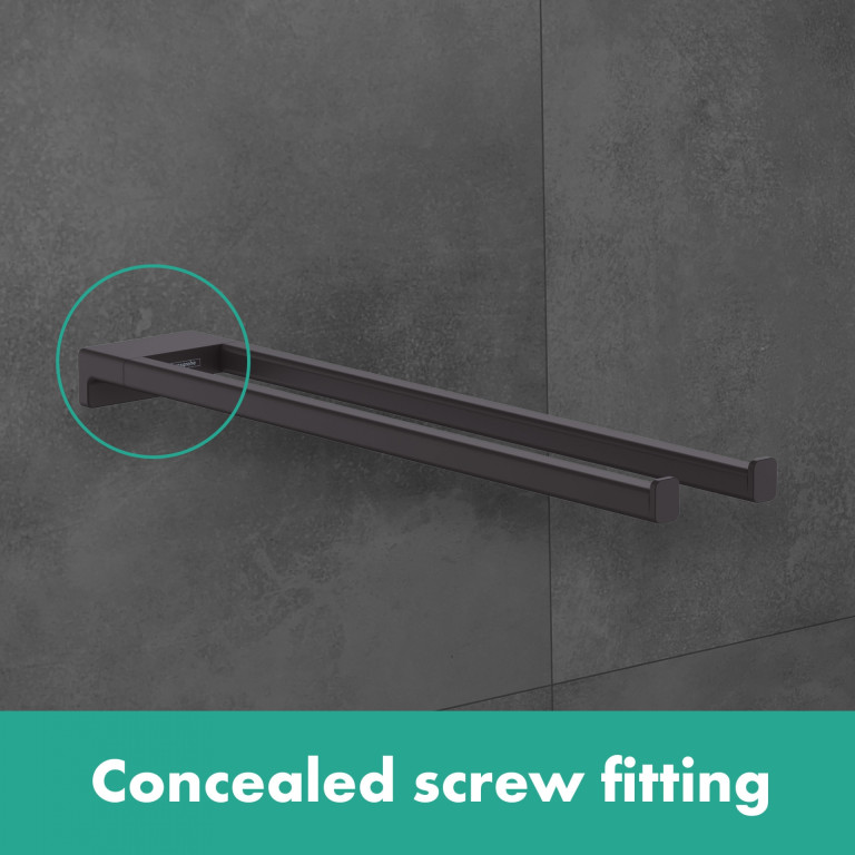 And the hansgrohe quality keeps the promises made by the premium design: THet AddStoris bath towel holder is made of metal, so it is made to last. This product is both a sustainable use of resources and it reduces the amount of plastic in bathrooms. The surface finish in a matt black colour is easy to clean and is one of the colour schemes in the range of hansgrohe special surface finishes for taps (FinishPlus). So everything can match perfectly.