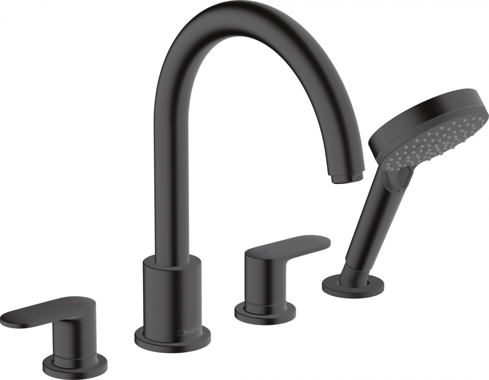 The hansgrohe Vernis Blend 4-hole rim-mounted bath mixer and shower head impresses users with its harmonious design and bold surface finish in matt black, while also bringing elegance, user-friendliness and showering indulgence to the bath tub. With a flow rate of up to 25.3 l/min, the bath tub is filled in no time at all. And at max. 17.9 l/min (at 3 bar), the 100 mm Vernis Blend hand shower provides the fun, comfort and convenience hansgrohe baths and showers are known for – all at a great price.