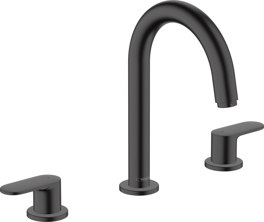 With its subtle elegance, harmonious design and bold matt black surface finish, the hansgrohe Vernis Blend 3-hole basin tap in matt black with pop-up waste set is the perfect fit for modern bathrooms. The water quantity and temperature can be set using the two separate, user-friendly and ergonomically shaped handles placed on the right and left of the tall spout. The tried-and-tested pop-up waste set made of robust plastic comes with the product and can be reliably opened and closed with one hand. The Vernis Blend taps also bring timeless design and tried-and-tested hansgrohe user-friendliness to the bathroom and are available at an attractive price.