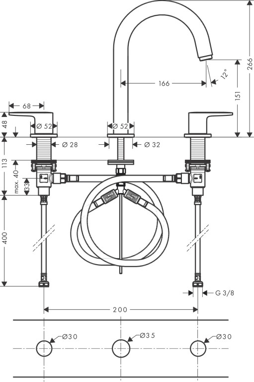 - Easy to install: The tap is attached via flexible connection hoses (G ⅜) to the water connections (size: DN15)