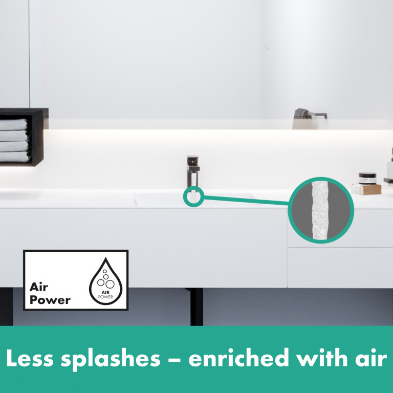 The water quantity and temperature can be set using the user-friendly and ergonomically shaped handle, which controls the high-quality hansgrohe ceramic mixer system and does not loosen, even after frequent use. Another advantage: This tap saves money and protects the environment, as the flow rate is automatically limited to 4.3 l/min, even when the water pressure is high (EcoSmart). The water is enriched with air for a full water jet and less splash (AirPower).- Bold contrast: Trendy matt black is a good fit for modern interior design
