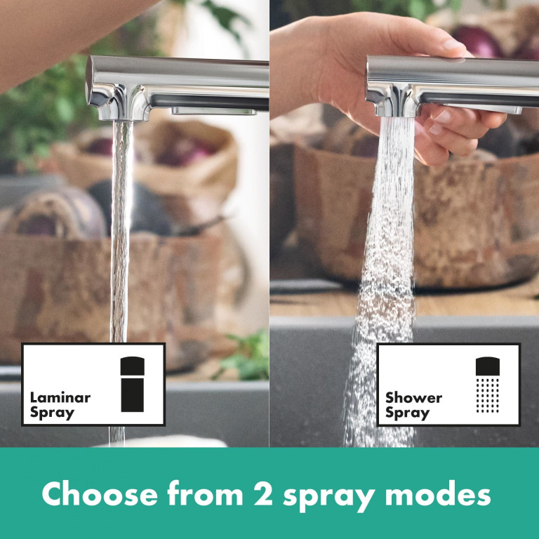 The Zesis 160 kitchen mixer with pull-out spray and 2 jet types is the first choice when it comes to an uncomplicated replacement or the initial equipment. The elegant faucet for the kitchen makes everyday work easier with helpful functions and impresses with the proverbial quality of hansgrohe.