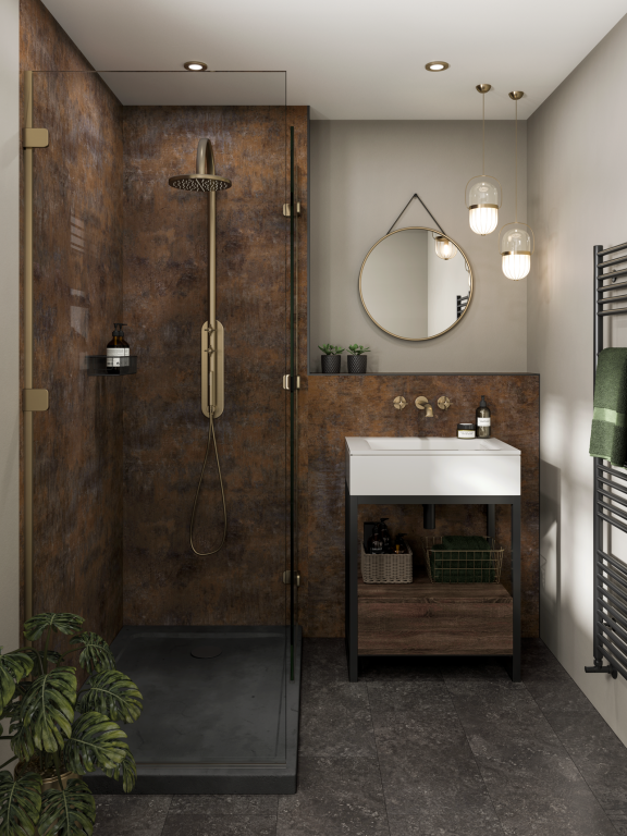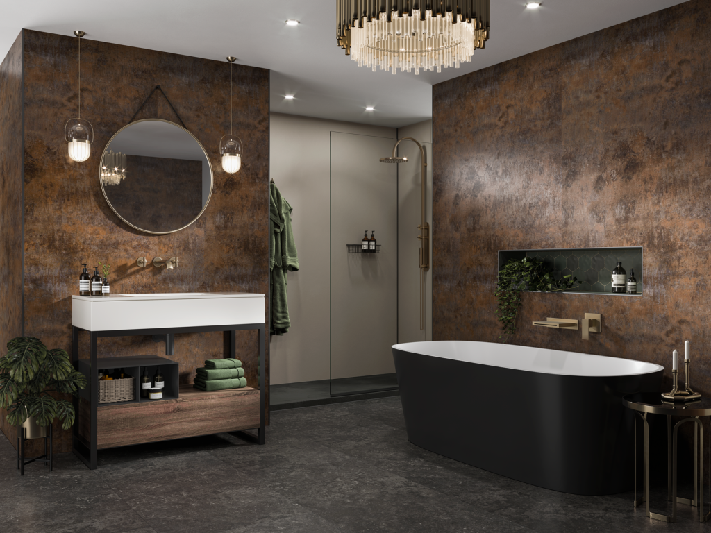 Corten Elements bathroom wall panels from the Linda Barker Collection are designed to mimic the rich tones and textures of weathered steel, perfect for achieving an ultra modern industrial look. This panel pairs beautifully with Clay from the Neutrals Collection and works equally well with chrome or copper fittings.