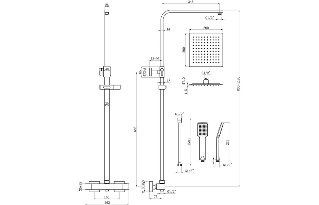 - Dimensions: Height 1180 x Width 263 x Depth 345mm