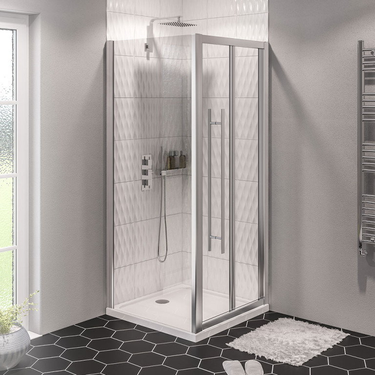 Vantage 2000 bifold door with 6mm tempered safety glass and easy clean finish. In chrome finish with fully concealed fixings, available with a range of side panels and trays to fit.