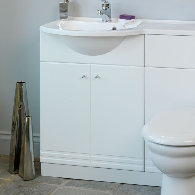Bonito 120 range allow for numerous combinations using laminate tops and optional 300mm left and right hand base units with corresponding wall cupboards. The 60cm mirror and cornice has two LED Lamps and a shaver socket.