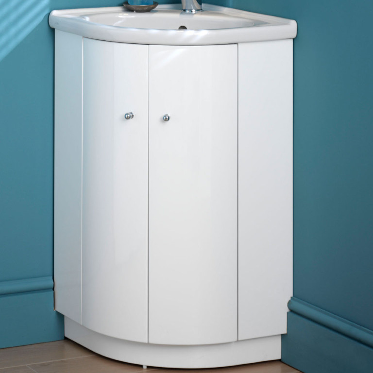 A perfect corner solution, finished in white gloss with a solid ceramic basin, mirror and cornice comes with single LED lamp operated by a pull cord. Basins are sold separately.