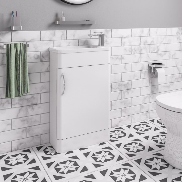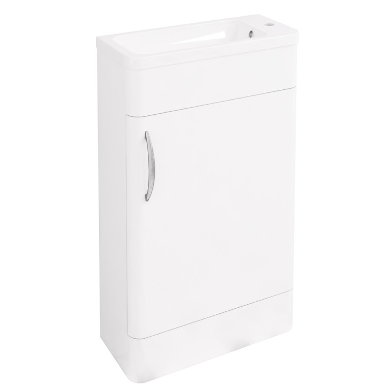 The Cavone bathroom furniture features a luxurious curved basin that flows perfectly with the curved lines of the doors of the vanity unit. Features soft close doors, interchangeable chrome or black handles, built in overflow. Unit only, basin sold separately.