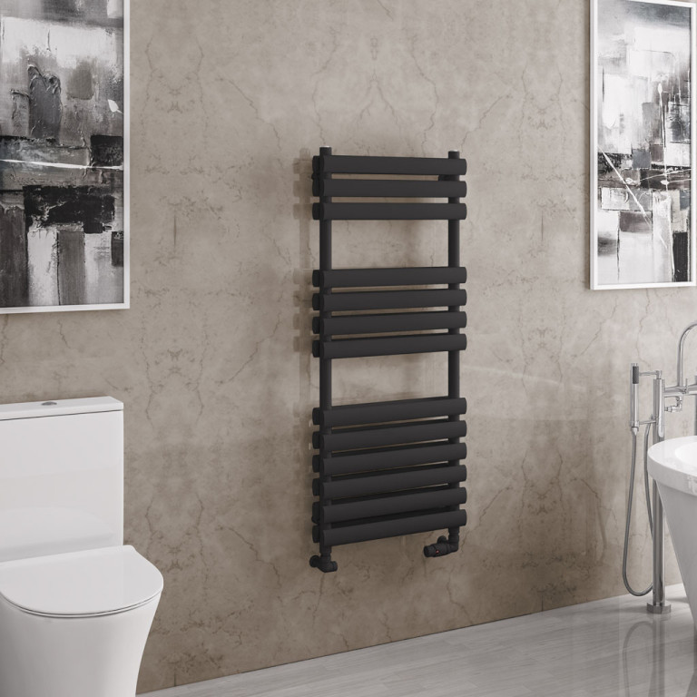 Double construction horizontal profiles in elliptical shape of this towel rail will warm your towels and also your bathroom. Available in 3 colour finishes, matt white, matt anthracite and matt black.