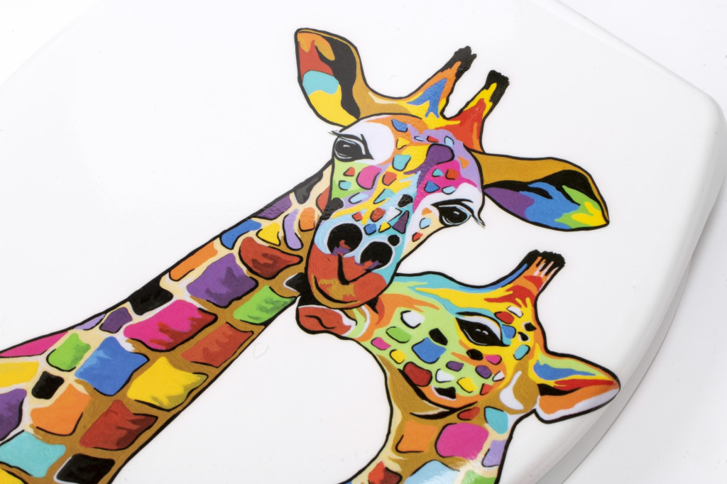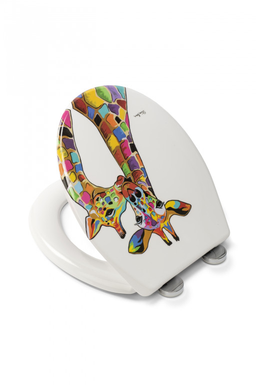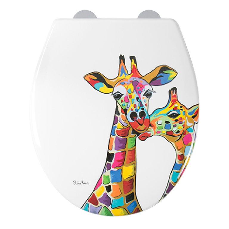 Enjoy a morning zoo with this vibrant toilet seat featuring original artwork from celebrated artist Steven Brown.