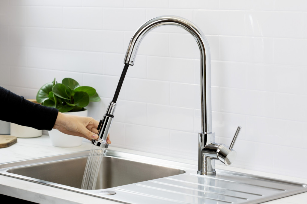 Smartly styled, the Apricot kitchen tap has a push-button operated spray function, making rinsing and washing food or dishes an easy job.