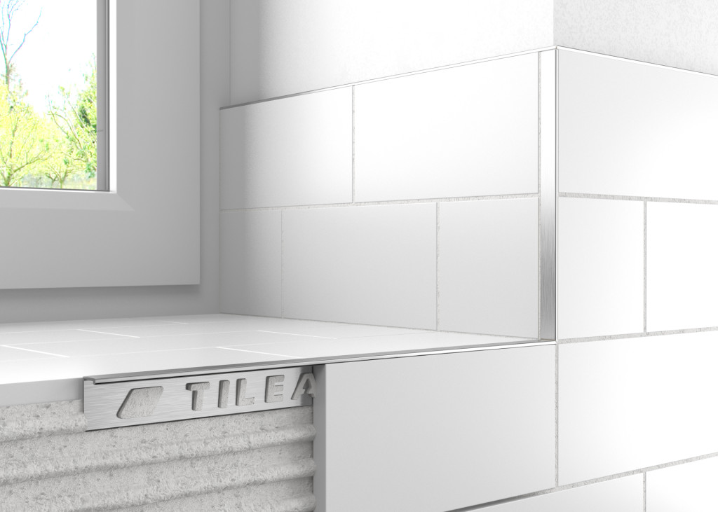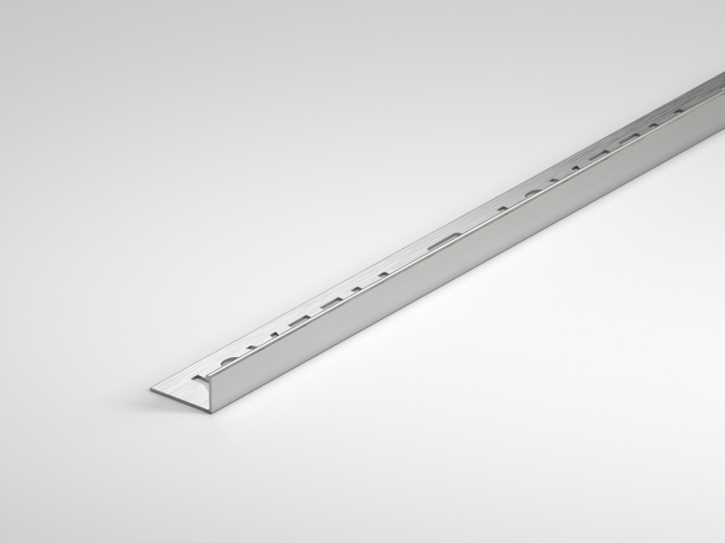 Straight metal profile to give a contemporary finish. Tiles sit under the lip of the trim and neatly abut the trim edge. Can be used outdoors.