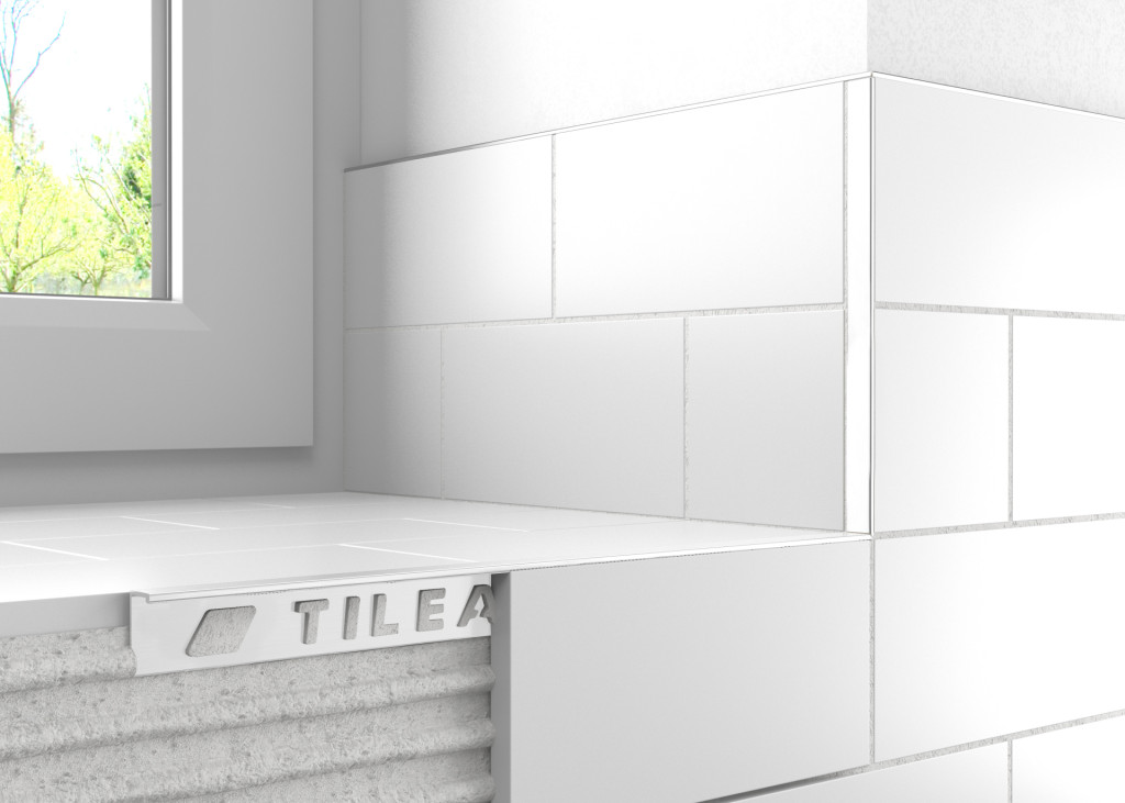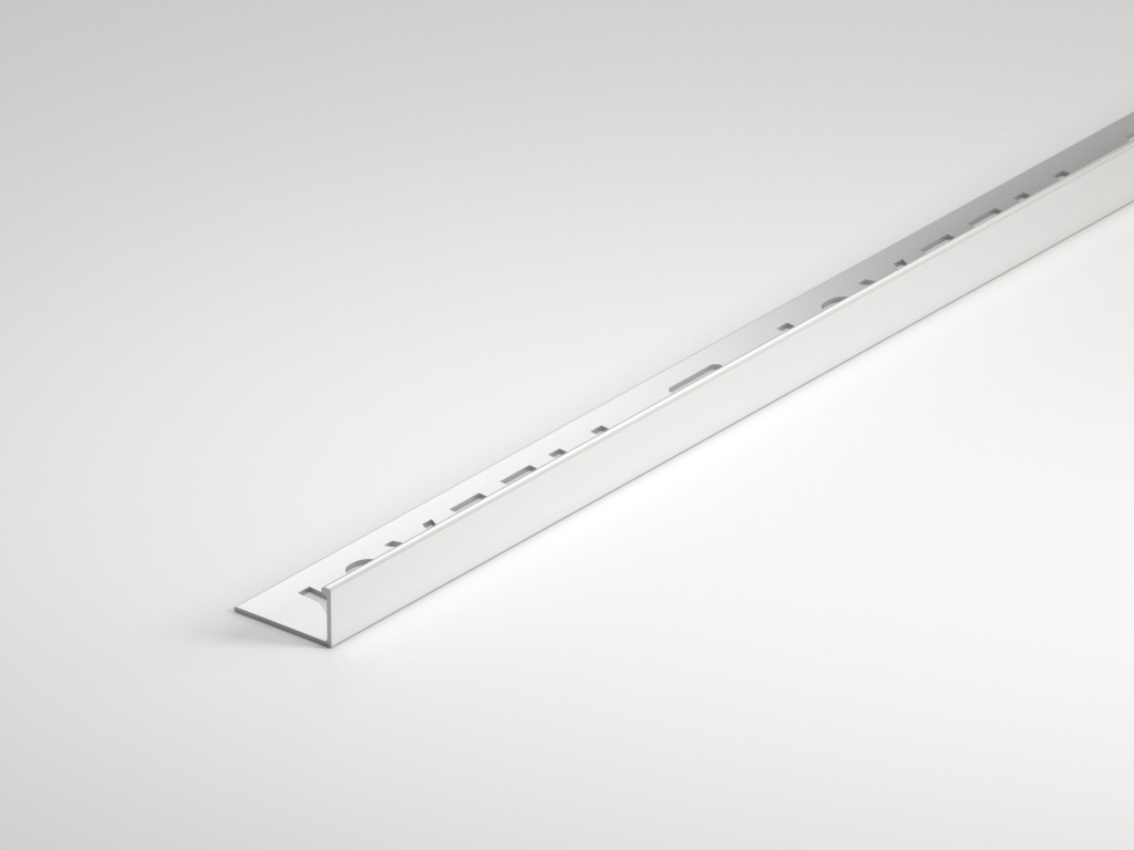 Straight metal profile to give a contemporary finish. Tiles sit under the lip of the trim and neatly abut the trim edge
