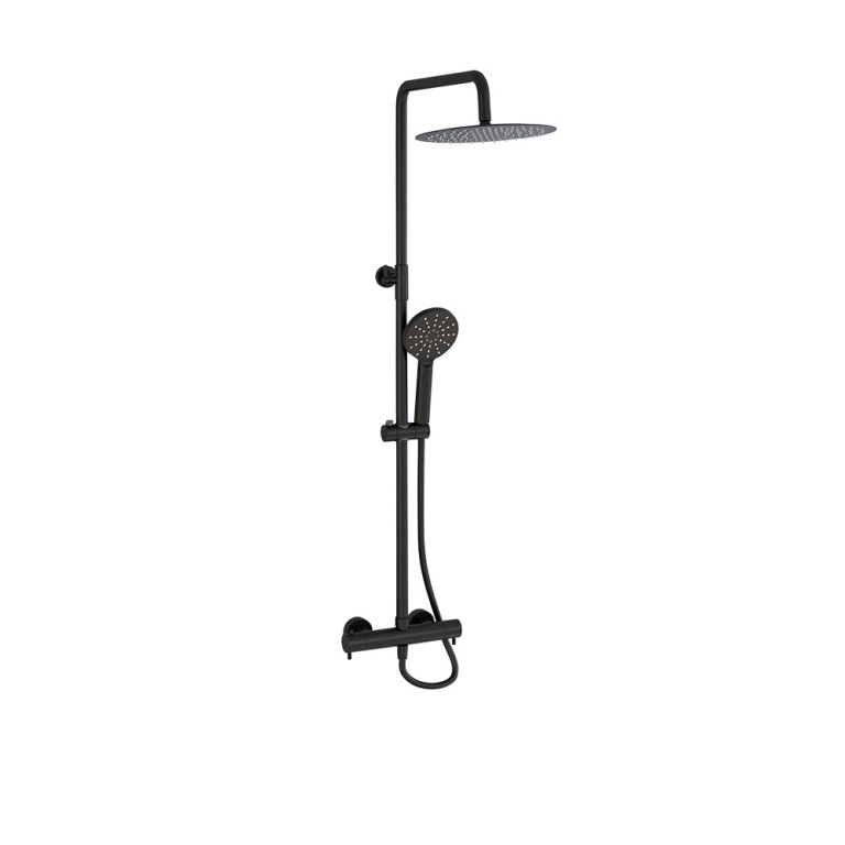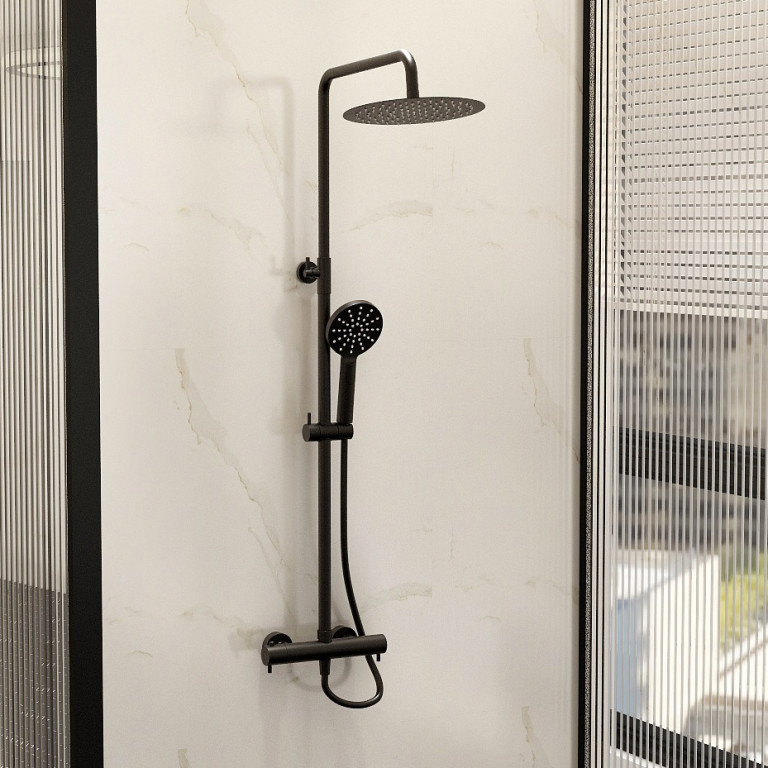 Ravine Cool Touch, Easy Fix, Thermostatic Shower Set in Cmatt Black with Fixed overhead shower and Multifunction sdjustable Handset