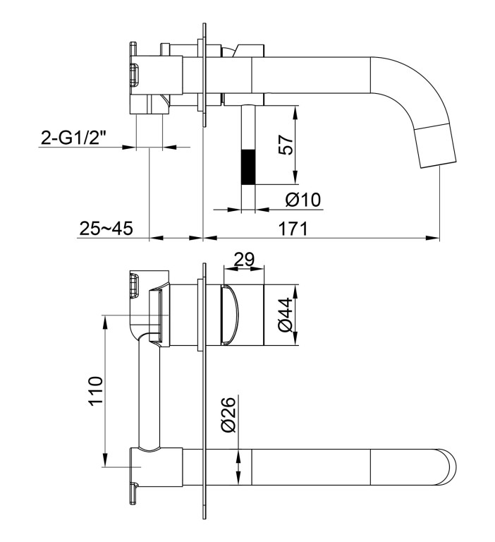 Ravine Two Hole Wall Mounted Basin Mixer in Matt Black with Universal Clicker Waste