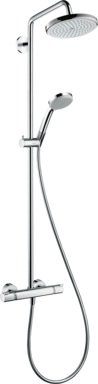 Consists of: overhead shower, hand shower, Thermostatic shower mixer, shower hose, slider, shower bar . overhead shower Croma 220. shower head size overhead shower: 220 mm. spray type overhead shower: RainAir. overhead shower angle adjustable. Maximum flow rate (at 3 bar): 9 l/min . flow rate RainAir 9 l/min at 3 bar. spray type hand shower: Rain, Massage spray, Shampoo spray, normal spray . Flow rate of hand shower (at 3 bar): 9 l/min . Min. operating pressure: 1,7 bar . Max. operating pressure: 10 bar . pipe can be shortened in height. Shower bar diameter: 22 mm . height-adjustable hand shower holder. shower arm length overhead shower: 400 mm. Swivel shower arm. thermostat Ecostat Comfort. safety stop at 40°C. adjustable hot water limitation. outlets controlled via volume control/diverter and may not be used simultaneously. exposed design allows easy installation, all working parts are outside of the wall. Connection dimension 1/2". Connection thread ½". Centre distance 150 mm ± 12 mm. variable wall support. Intrinsically safe against backflow. designed to run 2 outlets