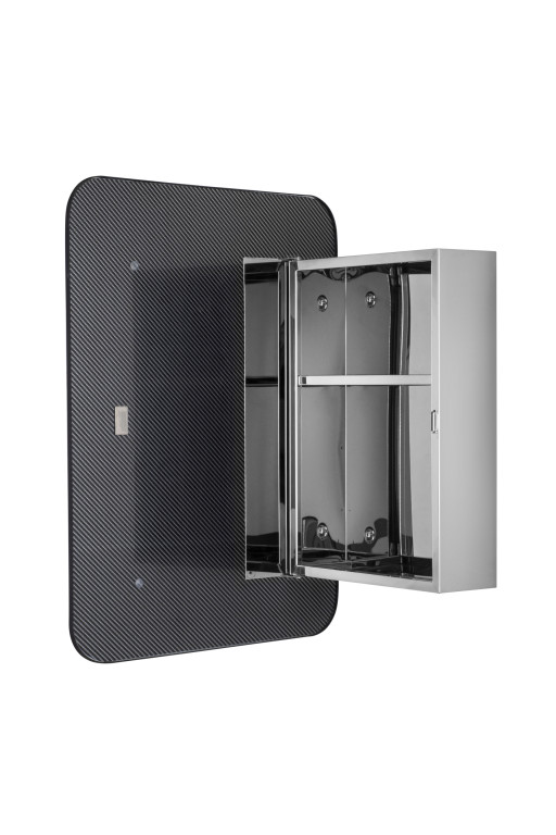 Supplied fully assembled with all fixings and fittings included.- High quality polished stainless steel cabinet with matt black metal framed mirrored door