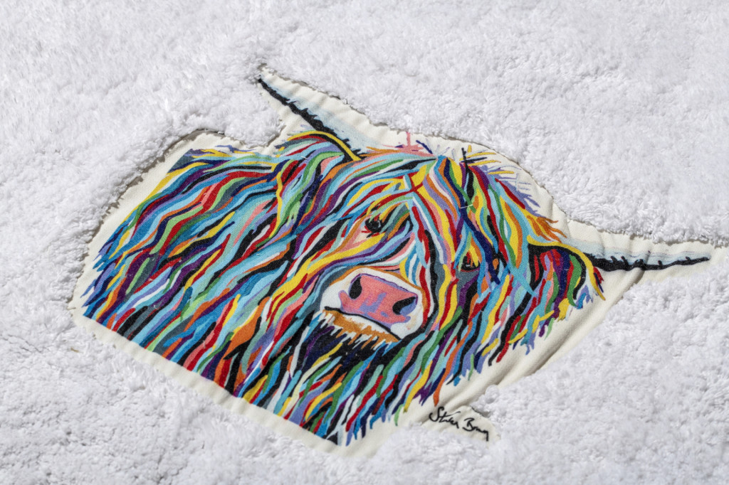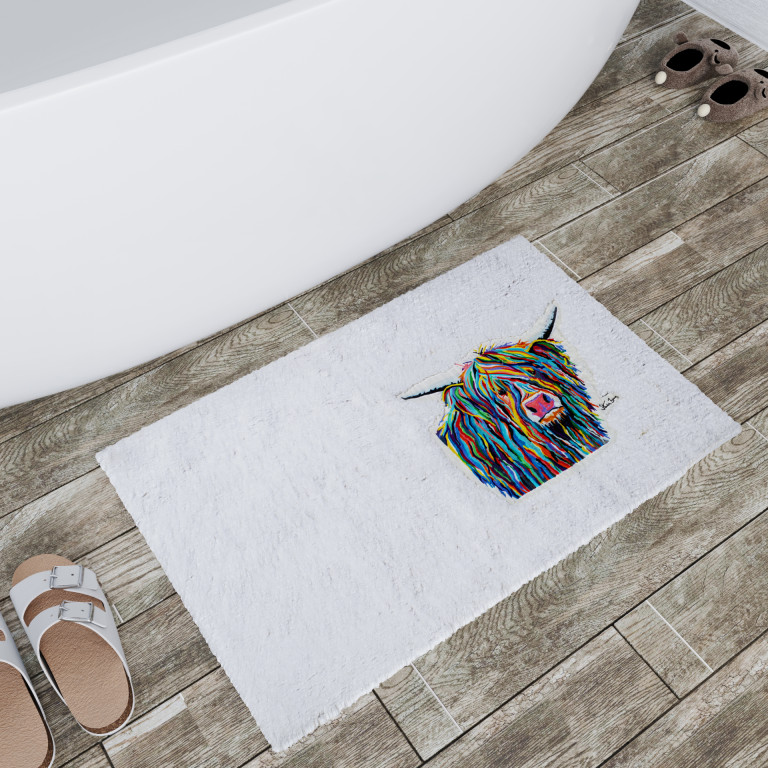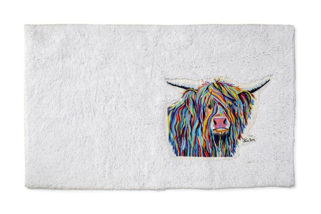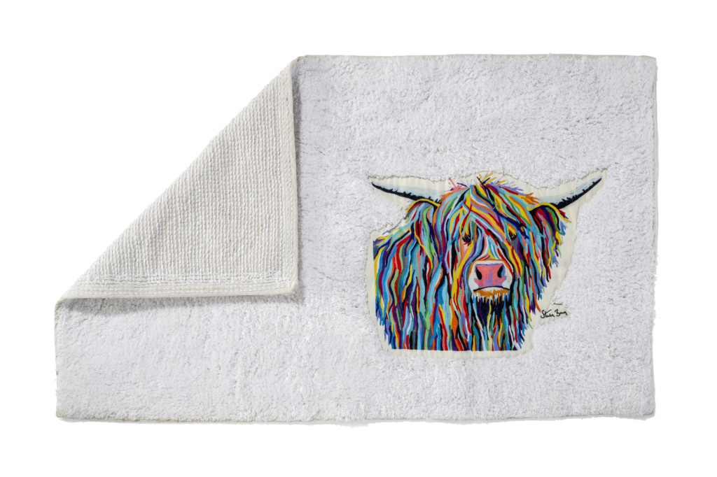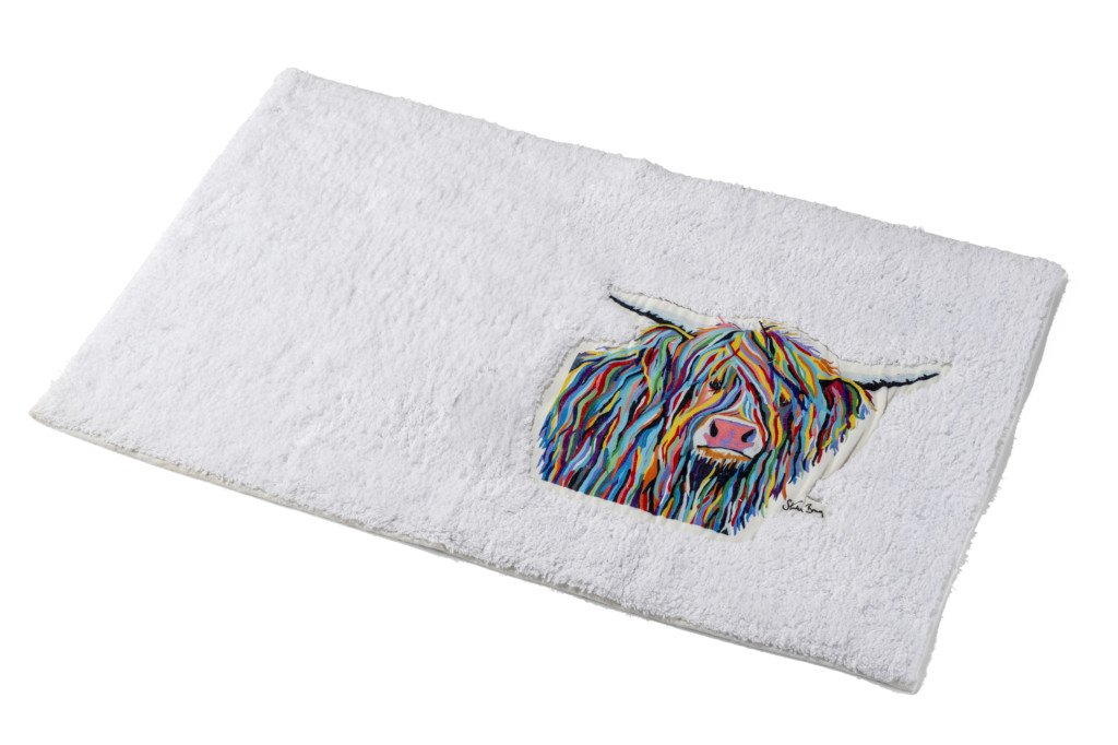 Enjoy a morning moo with this vibrant bath mat featuring original artwork from celebrated artist Steven Brown.