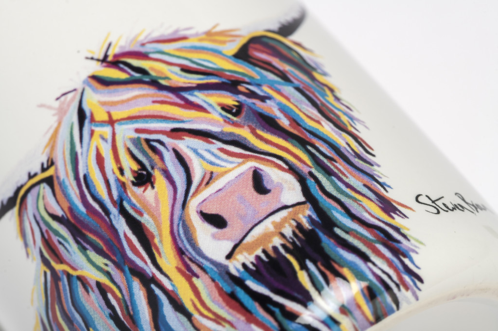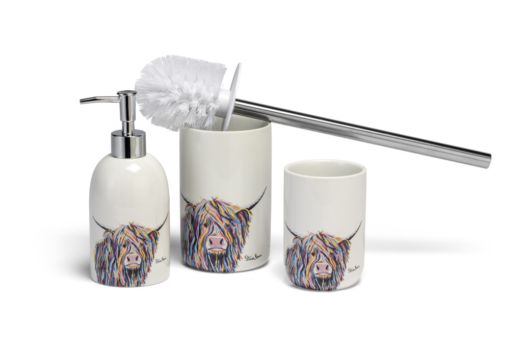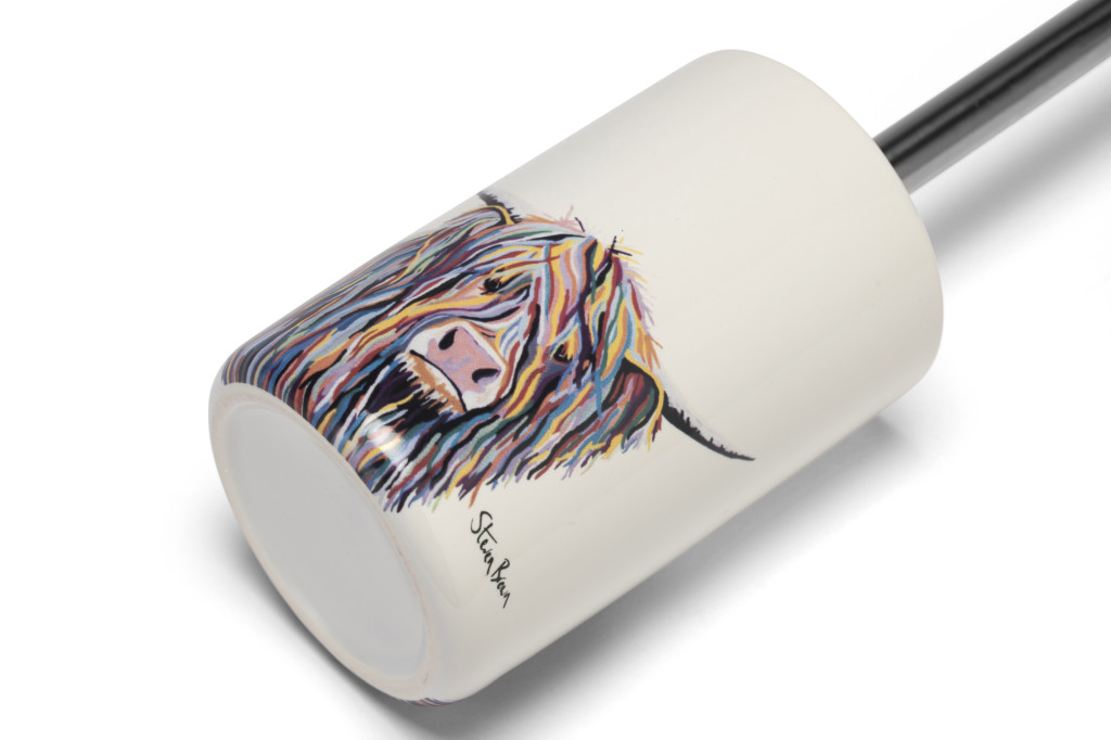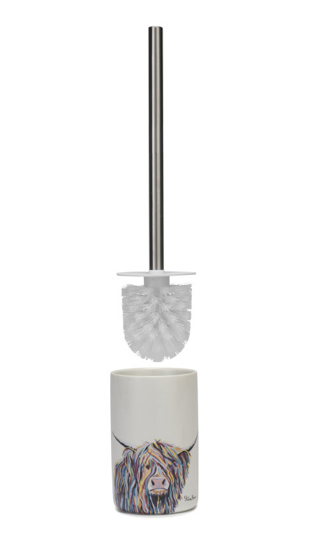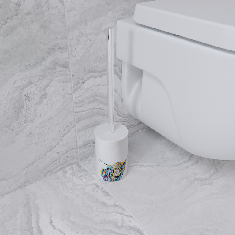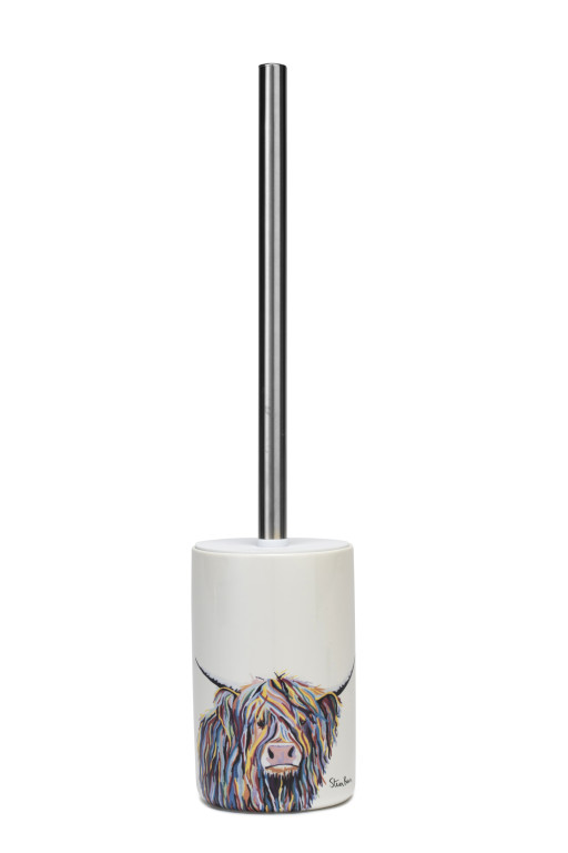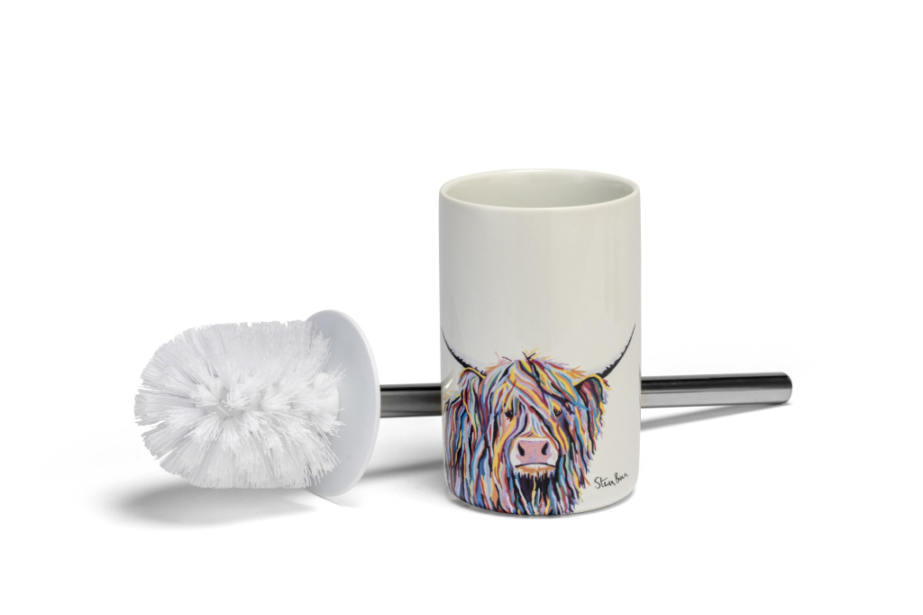 Enjoy a morning moo with this vibrant freestanding toilet brush and holder featuring original artwork from celebrated artist Steven Brown.