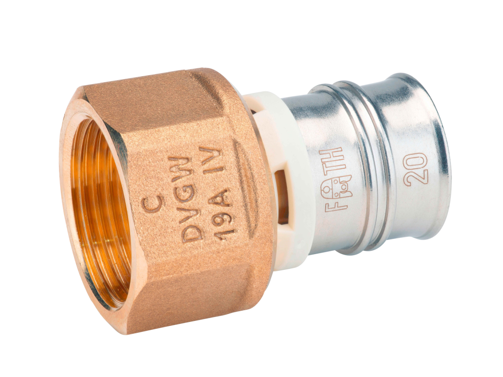 Female thread adapter according to DIN EN 10226-1 made of dezincification-resistant brass for drinking water and heating system installations featuring a white fixation ring with integrated inspection holes, fixed stainless steel pressing sleeve and leak function. Pressable with pressing contours F and TH.