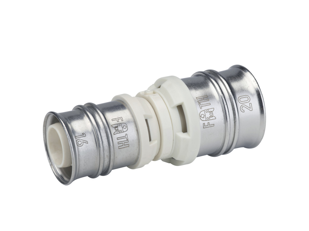 Reduced coupling made of PPSU for drinking water and heating system installations featuring white fixation rings with integrated inspection holes, fixed stainless steel pressing sleeves and leak function. Pressable with pressing contours F and TH.