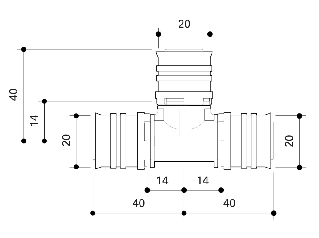 Tee made of PPSU for drinking water and heating system installations featuring white fixation rings with integrated inspection holes, fixed stainless steel pressing sleeves and leak function. Pressable with pressing contours F and TH.