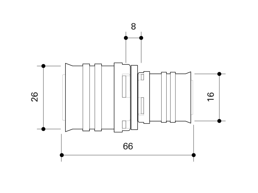 Reduced coupling made of PPSU for drinking water and heating system installations featuring white fixation rings with integrated inspection holes, fixed stainless steel pressing sleeves and leak function. Pressable with pressing contours F and TH.