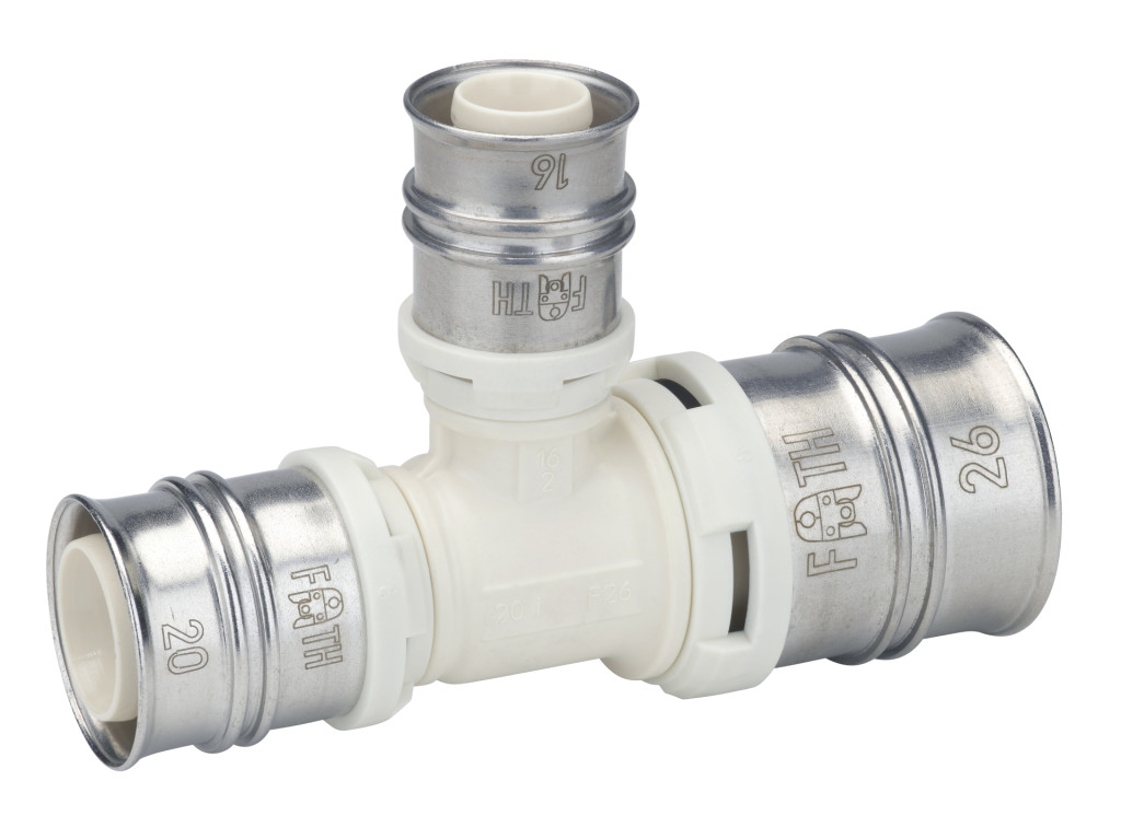 Reduced tee made of PPSU for drinking water and heating system installations featuring white fixation rings with integrated inspection holes, fixed stainless steel pressing sleeves and leak function. Pressable with pressing contours F and TH.