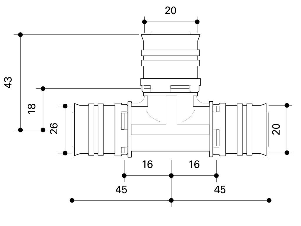 Reduced tee made of PPSU for drinking water and heating system installations featuring white fixation rings with integrated inspection holes, fixed stainless steel pressing sleeves and leak function. Pressable with pressing contours F and TH.