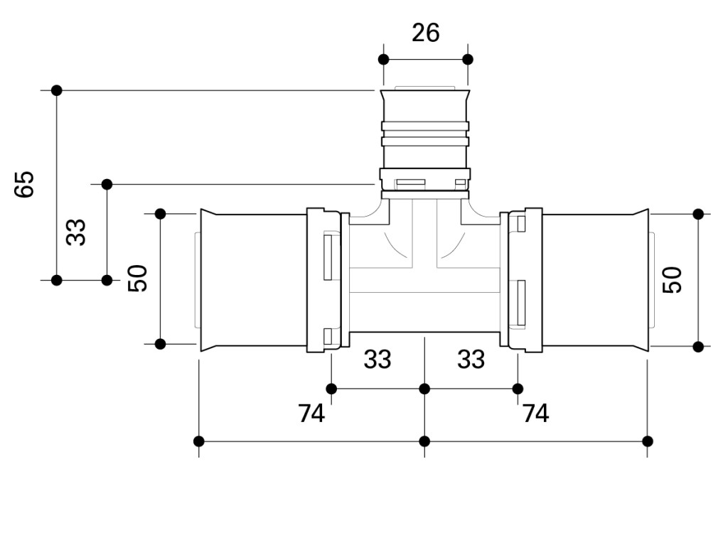 Reduced tee made of PPSU or dezincification-resistant brass for drinking water and heating system installations featuring white fixation rings with integrated inspection holes, fixed stainless steel pressing sleeves and leak function. Can be pressed using the F-contour, the dimensions smaller than or equal to 32 mm also with the TH pressing contour.