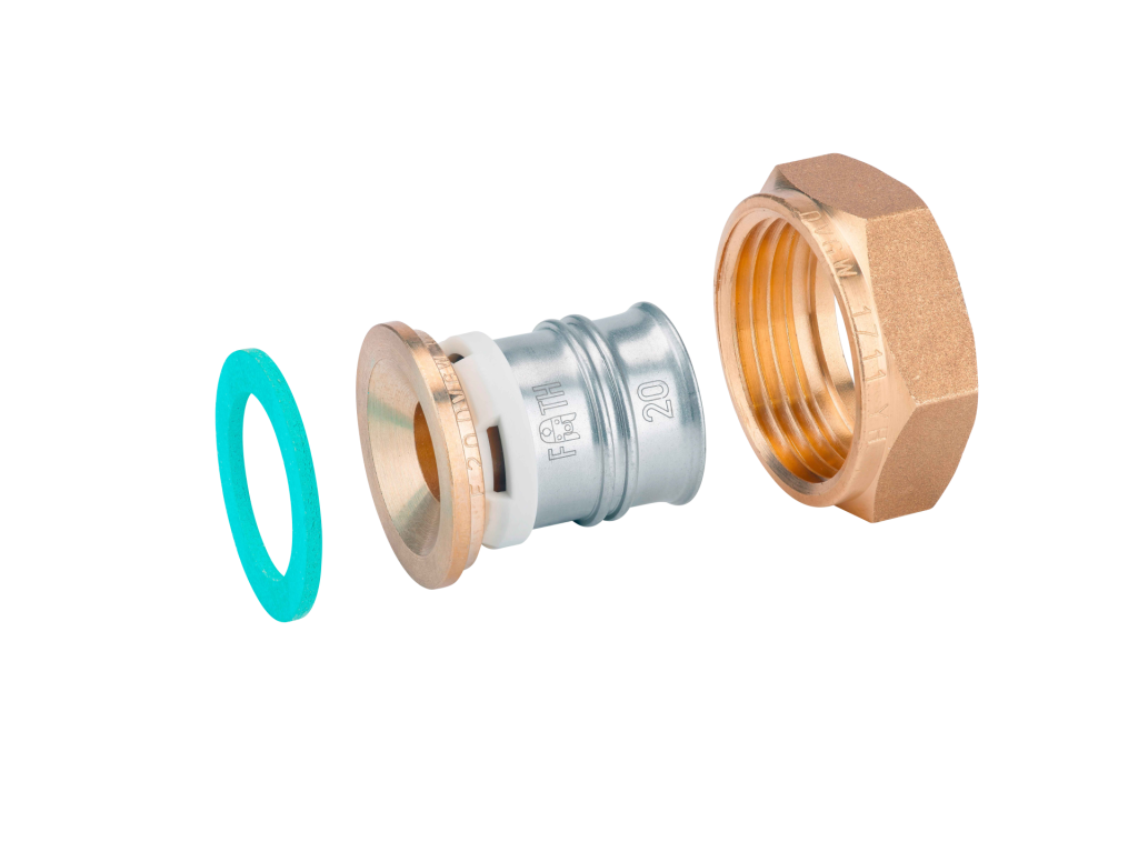 Flat-sealing adapter made of dezincification-resistant brass to create detachable connections in drinking water and heating systems featuring a white fixation ring with integrated inspection holes, fixed stainless steel pressing sleeve and leak function. Pressable with pressing contours F and TH.