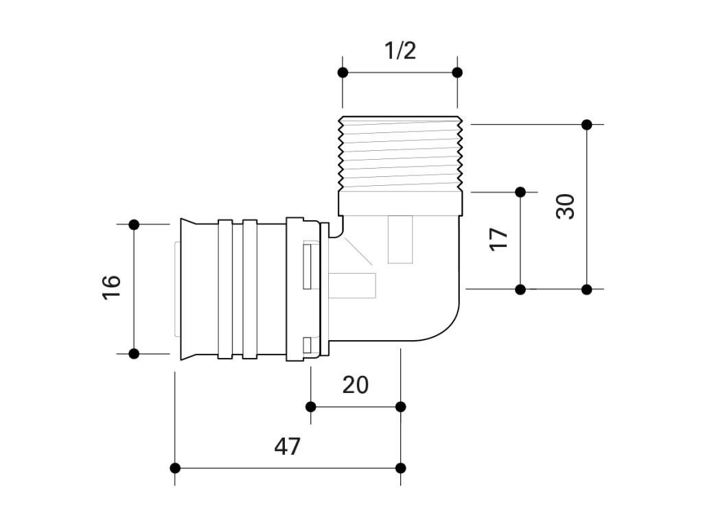 Male thread elbow adapter according to DIN EN 10226-1 made of dezincification-resistant brass for drinking water and heating system installations featuring a white fixation ring with integrated inspection holes, fixed stainless steel pressing sleeve and leak function. Pressable with pressing contours F and TH.