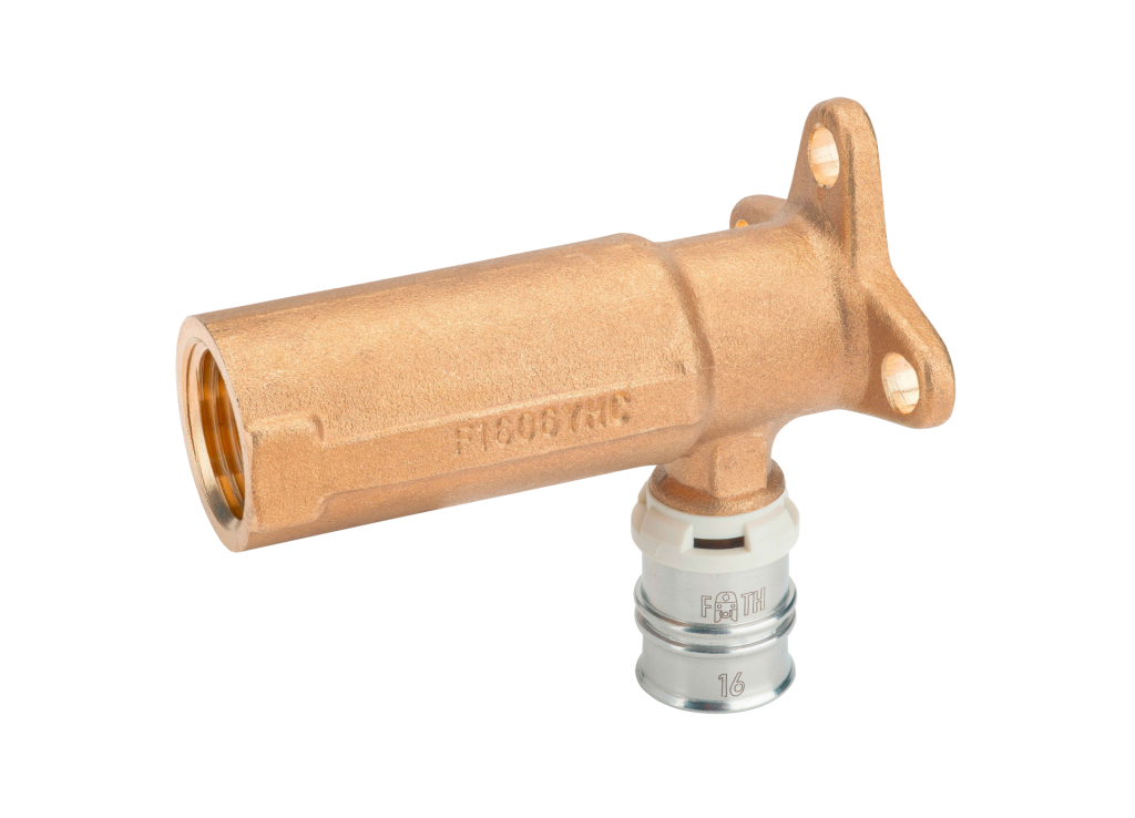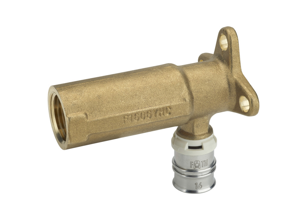 Female thread 78 mm wall mount elbow according to DIN EN 10226-1 made of dezincification-resistant brass for fitting connection in tee and serial installations in drinking water systems featuring a white fixation ring with integrated inspection holes, fixed stainless steel pressing sleeve and leak function. Pressable with pressing contours F and TH.