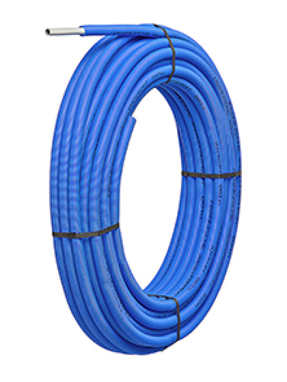 Multilayer composite pipe, colour: white, in coils made of cross-linked polyethylene (PE-Xb) as inner surface, longitudinally butt-welded aluminium pipe, and polyethylene of raised temperature resistance (PE-RT) as outer surface for drinking water and heating system installations, wrapped in PE-HD protective sheathing.
