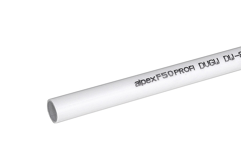 Multilayer composite pipe, colour: white, in straight lengths made of cross-linked polyethylene (PE-Xb) as inner surface, longitudinally butt-welded aluminium pipe, and polyethylene of raised temperature resistance (PE-RT) as outer surface for drinking water and heating system installations.
