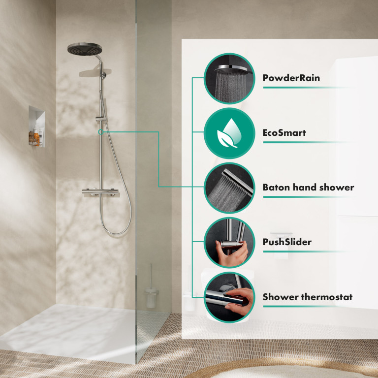 Pure design – pure showering pleasure. hansgrohe shower system with EcoSmart and PowderRain