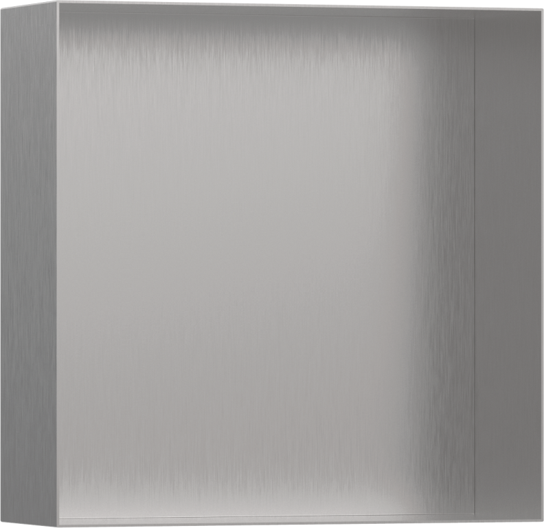 The XtraStoris Minimalistic wall niche 30 x 30 x 10 cm with brushed stainless steel body from hansgrohe is the stylish shelf solution for the modern wet area. The wall-integrated shelf offers extra space for personal care products thanks to its generous dimensions. The combination of brushed stainless steel body and frameless design underscores the minimalist effect of the wall niche. For a clear appearance and plenty of freedom of movement, the shelf can be integrated flush with the tile in the wall. Alternatively, the body can be installed at a distance of up to 55 mm out of the wall. That makes the shelf a formative design element, especially in the modern bathroom, and the ideal companion for hansgrohe FinishPlus products. The result is an exclusive seamless bathroom design.